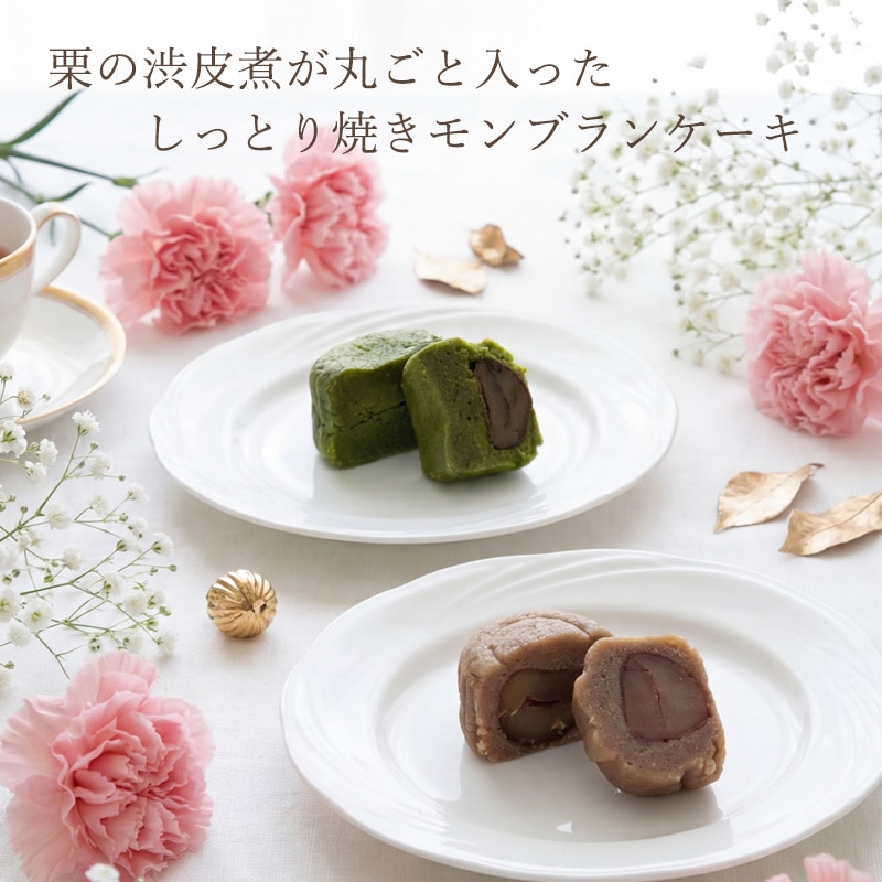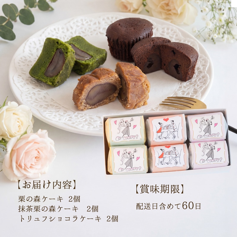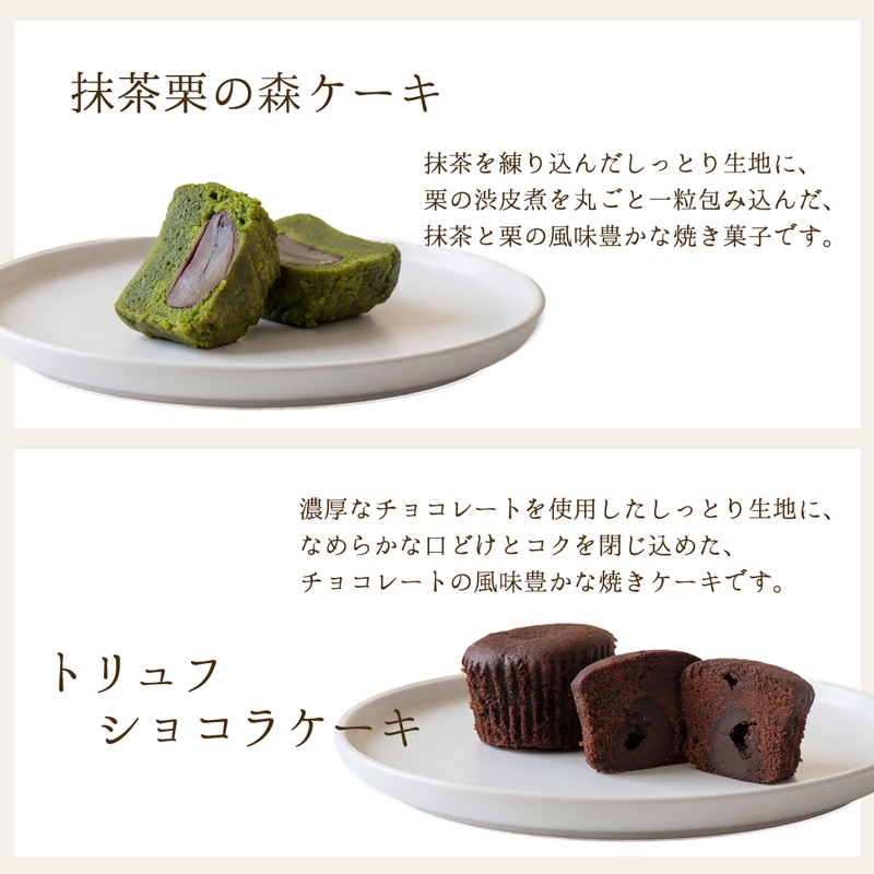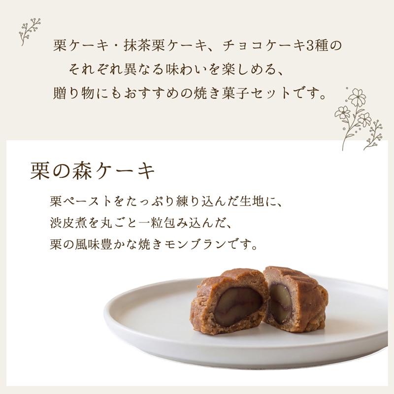 栗の渋皮煮が丸ごと一つ入った2種の栗ケーキにチョコ入りショコラケーキが入った3種類楽しめるギフトです。