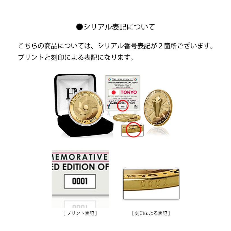 世界の頂点をかけて熱戦が繰り広げられる、WORLD BASEBALL CLASSIC。本商品は、東京プール presented by ディップの開催を記念した、郵便局限定オリジナルデザインのゴールドコインです。表面にはWORLD BASEBALL CLASSIC公式ロゴ、裏面には大会トロフィーデザインを刻印。直径約39mm、22ktゴールドメッキを施した存在感ある仕様に仕上げました。製造は米国The Highland Mint社。ブラックのジュエリーケースに収め、コレクション性の高い特別仕様に仕上げました。世界限定2,026個、シリアルナンバー入り。東京開催の記念を華やかに刻む、特別なメモリアルモデルです。