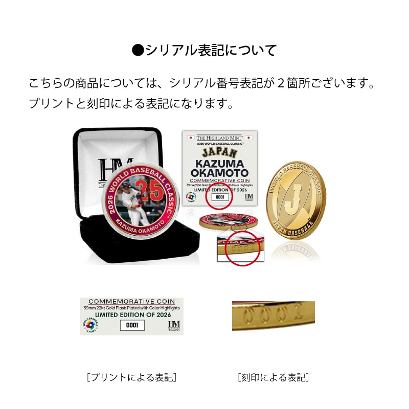 表面には躍動感あふれる【岡本和真選手】のデザインを大胆にレイアウト。裏面にはWORLD BASEBALL CLASSIC公式ロゴを刻印した特別仕様です。直径約39mmの存在感あるコインに22ktゴールドメッキを施し、重厚感と高級感を兼ね備えたメモリアルアイテムに仕上げました。
