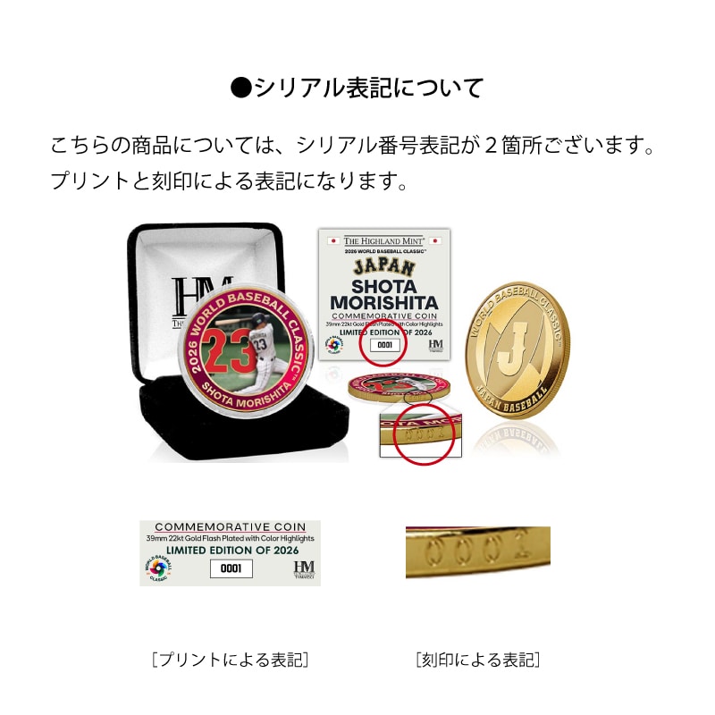 表面には躍動感あふれる【森下翔太選手】のデザインを大胆にレイアウト。裏面にはWORLD BASEBALL CLASSIC公式ロゴを刻印した特別仕様です。直径約39mmの存在感あるコインに22ktゴールドメッキを施し、重厚感と高級感を兼ね備えたメモリアルアイテムに仕上げました。