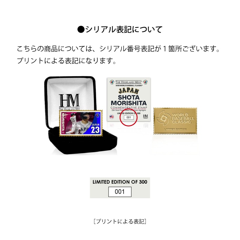 切手をモチーフにした印象的なフォルムに、【森下翔太選手】の躍動感あふれるビジュアルをレイアウト。さらに、WORLD BASEBALL CLASSIC公式ロゴを刻印した22ktゴールドメッキ仕様のプレートに仕上げました。コンパクトなサイズながらも高級感と存在感を兼ね備えた、コレクション性の高いメモリアルアイテムです。