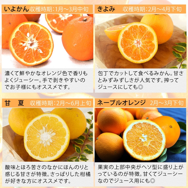 かんきつ類の時期は目安であり、収穫状況によって変動します。 表記の時期に必ずそのかんきつ類が入るという確約ではありませんのでご注意ください。ご希望のかんきつ類が入っていない、柑橘の特性による味のお好みなど、お客様のご都合による返品・交換はいたしかねます。