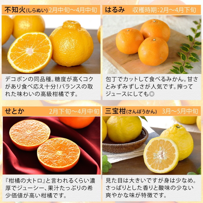 かんきつ類の時期は目安であり、収穫状況によって変動します。 表記の時期に必ずそのかんきつ類が入るという確約ではありませんのでご注意ください。ご希望のかんきつ類が入っていない、柑橘の特性による味のお好みなど、お客様のご都合による返品・交換はいたしかねます。