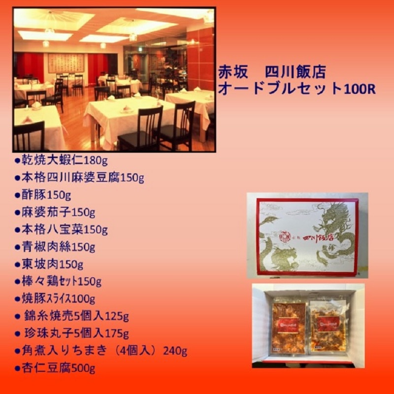 商品内容: 乾焼大蝦仁180g、本格四川麻婆豆腐150g、酢豚150g、麻婆茄子150g、本格八宝菜150g、青椒肉絲150g、東坡肉150g、棒々鶏セット150g、焼豚スライス100g、 錦糸焼売5個入125g、 珍珠丸子5個入175g、角煮入りちまき(4個入)240g 、杏仁豆腐500g