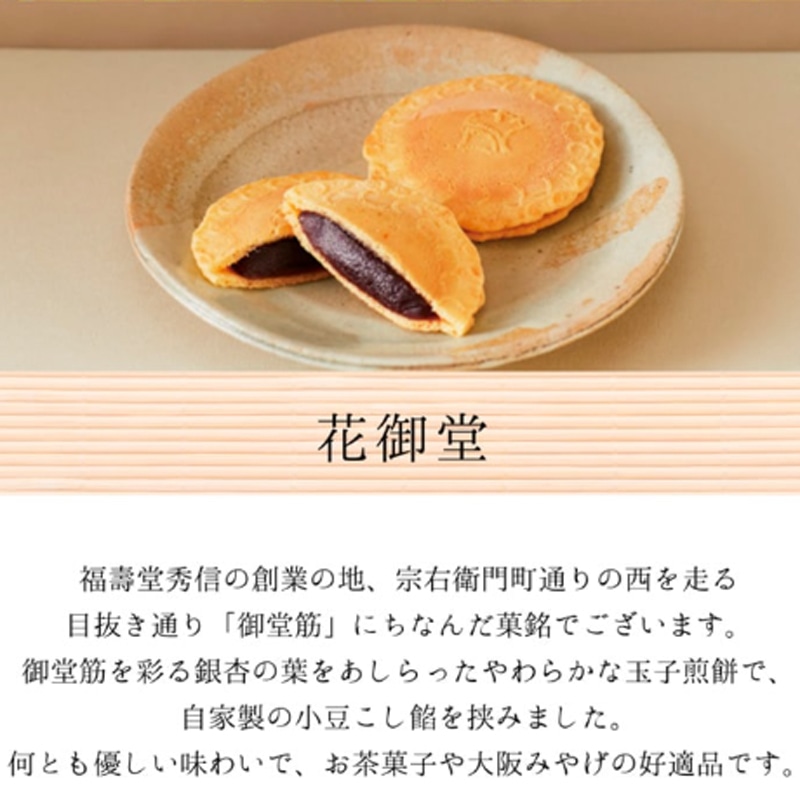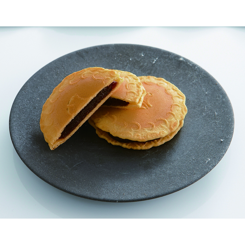 しっとりとした卵煎餅で自家製の小豆こし餡をはさんでおり、長年にわたる多くの方々に愛されてきたお茶菓子の好適品です。卵煎餅には御堂筋を彩る銀杏の図案を型押しいたしました。