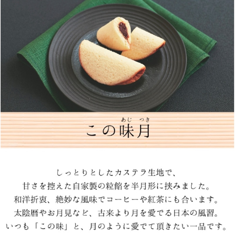北海道十勝産の小豆を使った粒餡を、よりおいしく召し上がっていただけるように、長年工夫を重ねてきた一品です。しっとりとしたカステラ生地で甘さを控えた自家製粒餡を半月上に挟みました。