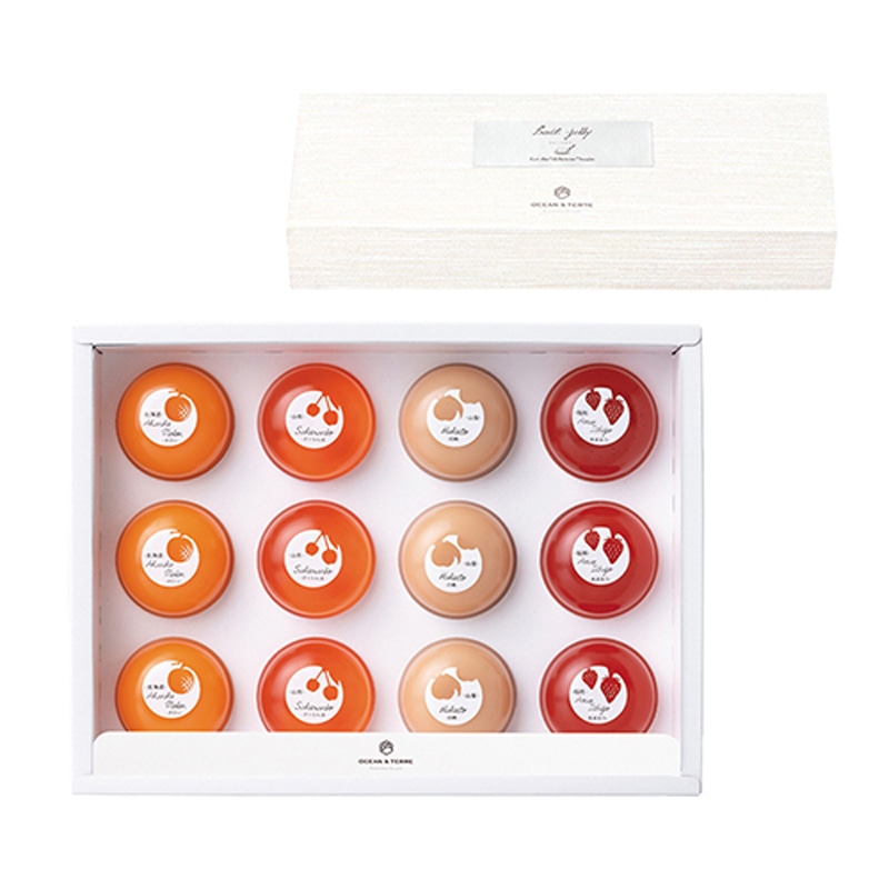 【北海道 赤肉メロンゼリー】砂糖・ぶどう糖果糖液糖(国内製造)、メロンピューレ(赤肉メロン(北海道産))、グラニュー糖、加糖れん乳/ゲル化剤(増粘多糖類)、酸味料、香料、着色料(カロテノイド)、(一部に乳成分を含む)【山形県 さくらんぼゼリー】砂糖・ぶどう糖果糖液糖(国内製造)、さくらんぼ果汁(さくらんぼ(山形県産))、グレナデンシロップ、グラニュー糖、寒天/酸味料、ゲル化剤(増粘多糖類)、香料、酸化防止剤(酵素処理ルチン)、着色料(カラメル、赤102)【山梨県 白桃ゼリー】砂糖・ぶどう糖果糖液糖(国内製造)、もも果汁、ももピューレ(もも(山梨県産))、グラニュー糖、加糖れん乳/ゲル化剤(増粘多糖類)、酸味料、酸化防止剤(酵素処理ルチン)、香料、(一部に乳成分・ももを含む)【福岡県 あまおう苺ゼリー】グラニュー糖(国内製造)、グレナデンシロップ、いちごピューレ(いちご(あまおう(福岡県産))、レモン果汁/ゲル化剤(増粘多糖類)、酸味料、香料、酸化防止剤(酵素処理ルチン)、着色料(カラメル、赤102)