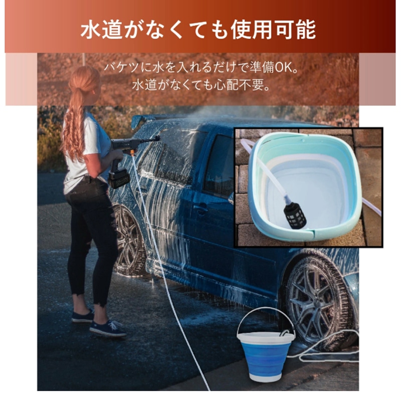 ●バケツに水を入れるだけで準備OK。水道がなくても使用可能。