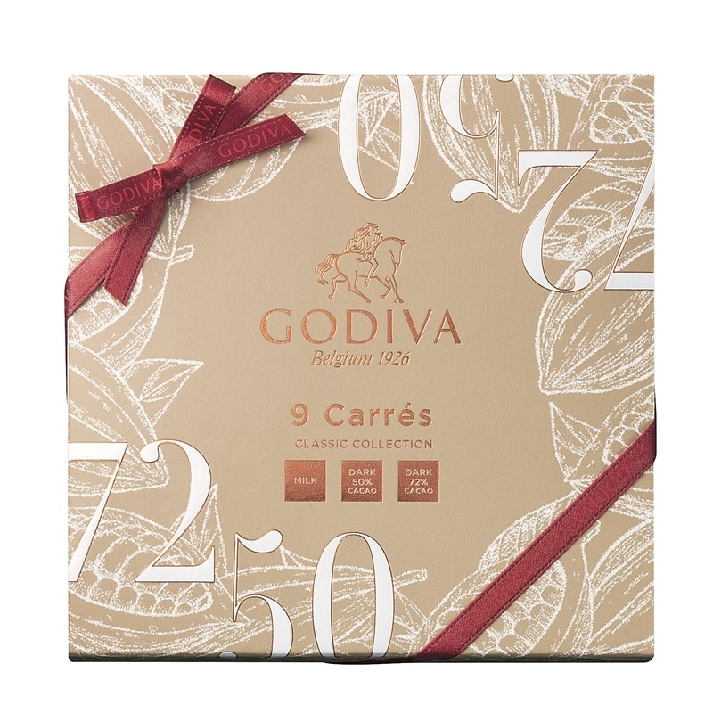 ゴディバのチョコレートへのこだわりが際立つ、薄いスクエアタイプのチョコレート、カレのアソートメントが装い新たに登場。美しいカカオを描いたパッケージに、カカオを存分に堪能できるミルク、カカオ50%ダーク、カカオ72%ダークの3種類のカレを詰め合わせました。
