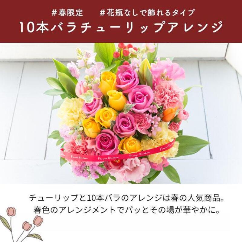 チューリップと10本バラのアレンジは春の人気商品! 春色のアレンジメントでパッとその場が華やかに。
