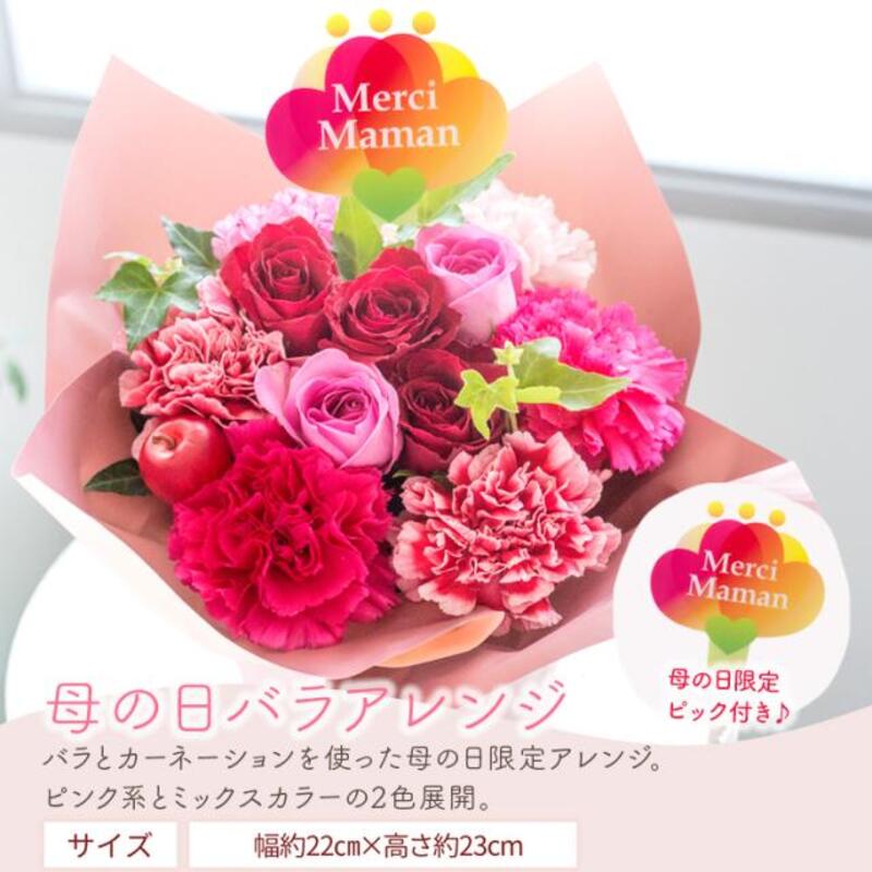 バラとカーネーションを使った母の日限定アレンジ(カラー:ミックス)とスイーツのセットです。