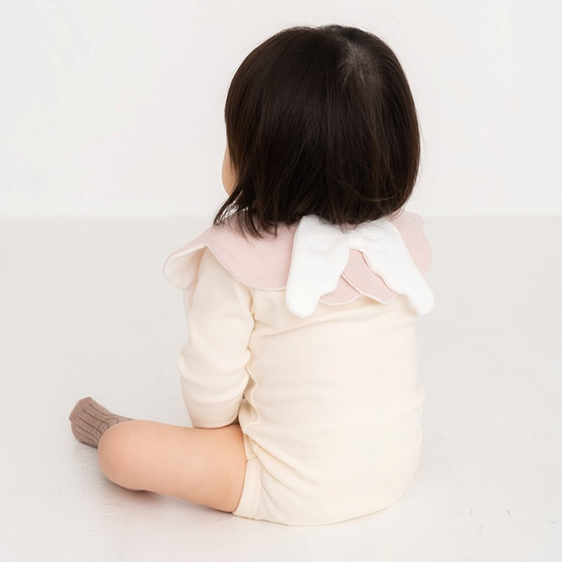 対象年齢:3ヵ月〜。肌触りがよく吸水性に富んだガーゼ素材を使用したスタイ。もこもことした形が愛らしく、背中には天使の羽が。まさに天使のような赤ちゃんにぴったりのスタイです。スナップボタン仕様でワンタッチ装着。