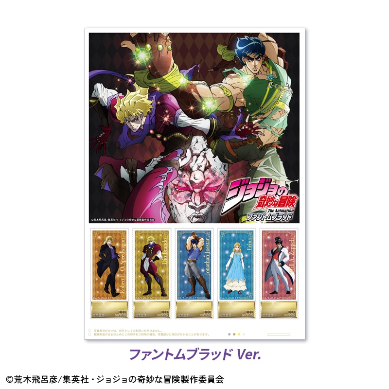 ジョナサン、ディオ、ジョセフ、シーザーなどが登場するフレーム切手に擬音シーンにフォーカスしたポストカード、オリジナルアートステッカーがついたセット商品です。