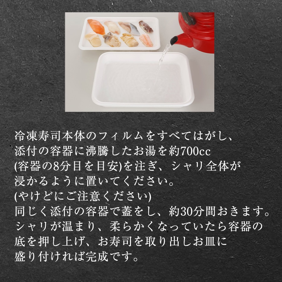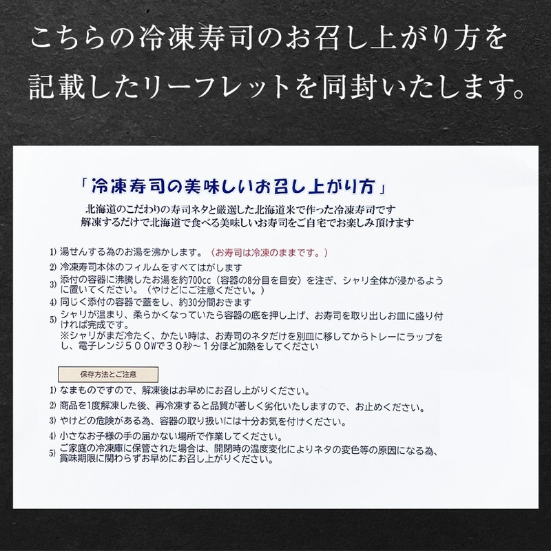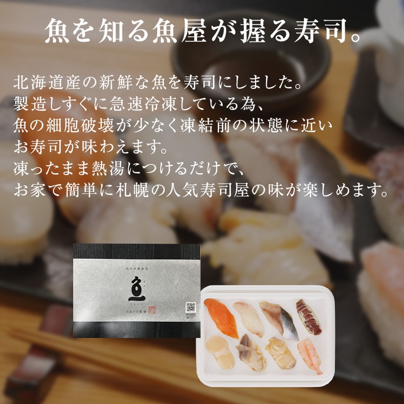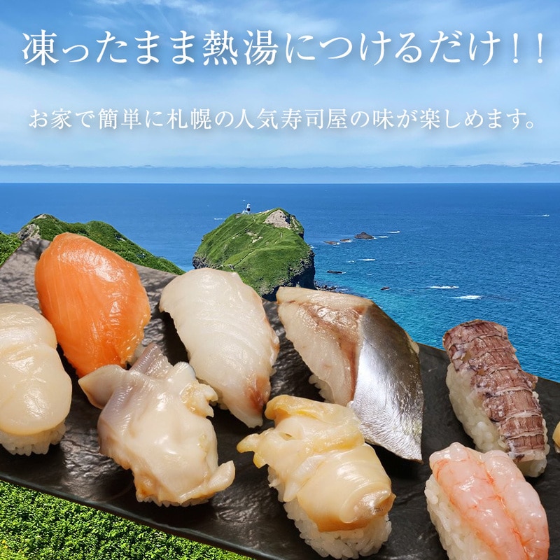 北海道産の新鮮な魚を寿司にしました。凍ったまま熱湯につけるだけで、お家で簡単に札幌の人気寿司屋の味が楽しめます。