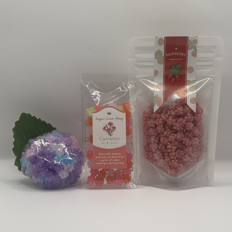 【あじさいの栞、ラズベリーの金平糖、フラワートリップ(カーネーション)】