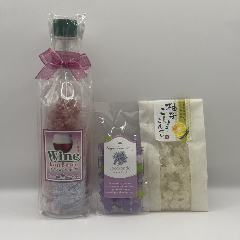 【ワイン・コンペイ(ボトル)、柚子こしょうこんぺい、フラワートリップ(ジャガランダ)】