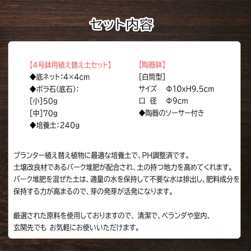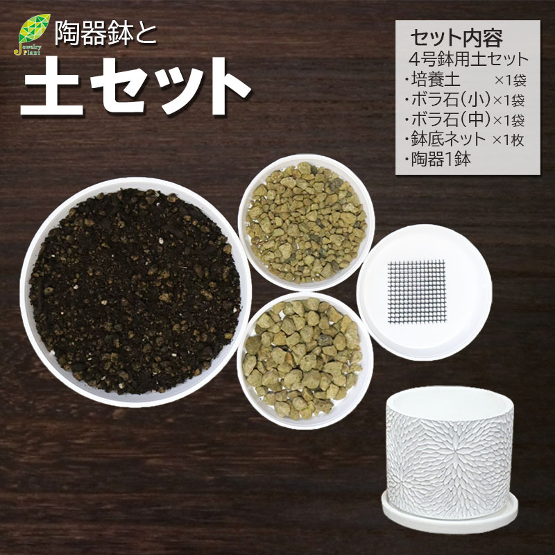 おしゃれな陶器鉢と、培養土・ボラ石・鉢底ネットが付いた便利な植え替えセットです。