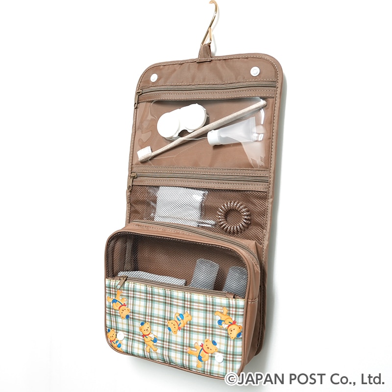 フック付きで吊るして使える便利な仕様。フラットポケット2つとマチ付きポケット1つを備えており、洗面道具やメイク用品をすっきり整理できます。