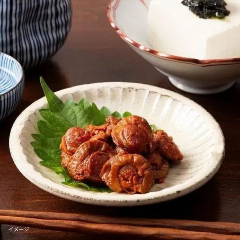 ・原材料名:ほたて(北海道)、タラチャンジャ(塩蔵タラ胃、唐辛子粉、食塩、すりにんにく、その他)、唐辛子 /調味料(アミノ酸等)、増粘多糖類、(一部に小麦・えび・ごま・大豆を含む)