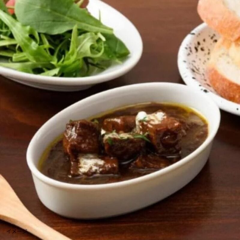 ・商品説明:牛肉を赤ワインとにんじんやたまねぎの濃厚なソースで煮込んだ一品。