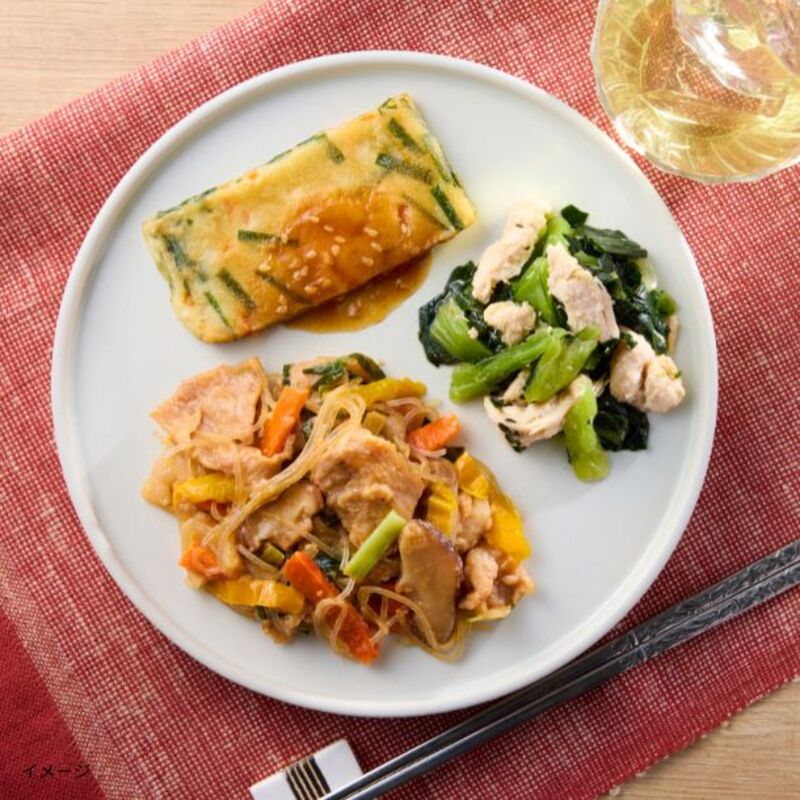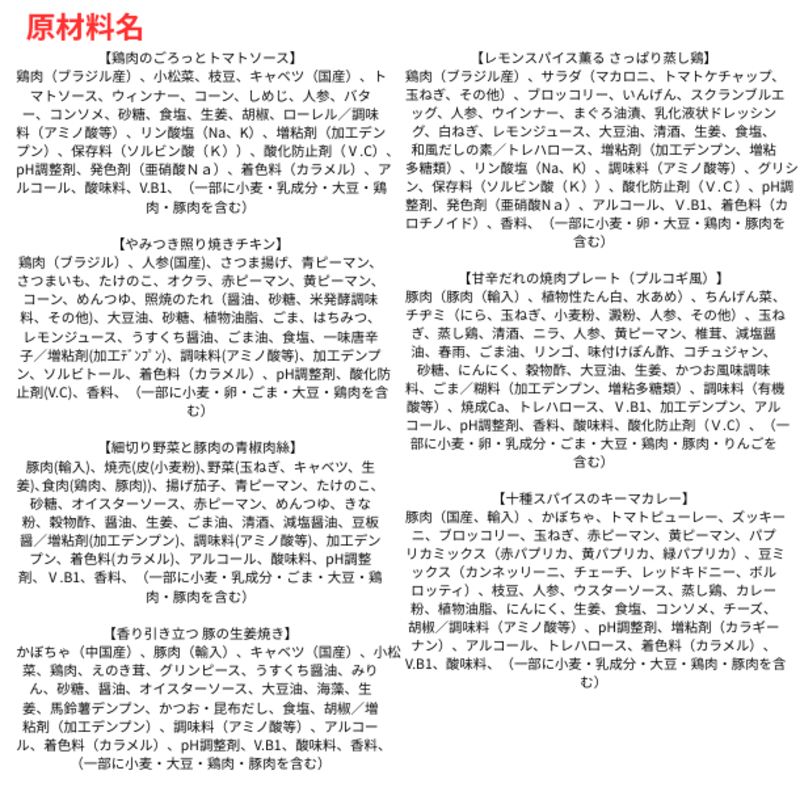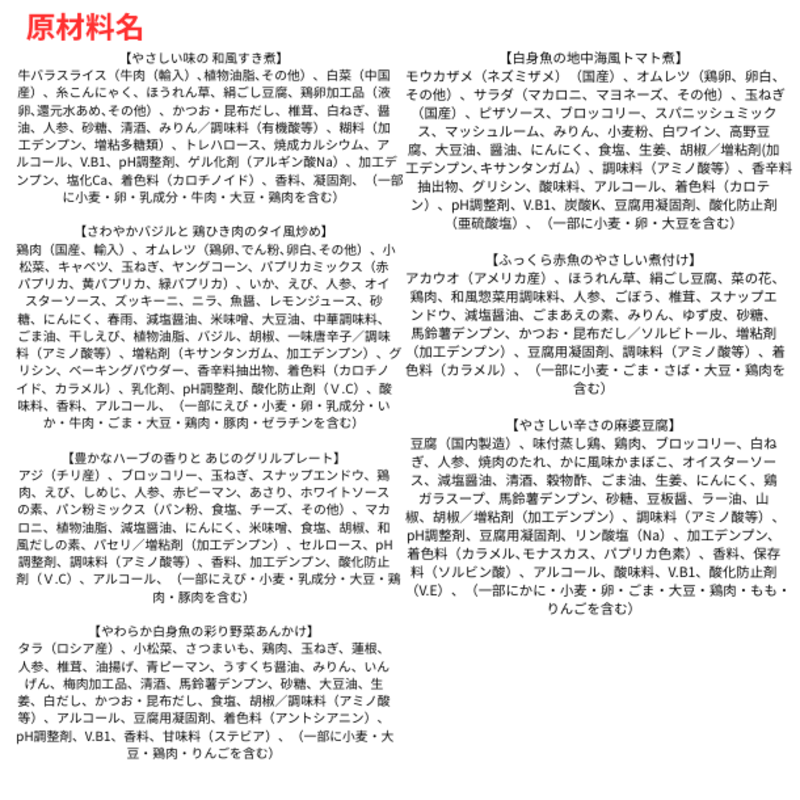 ・内容量: 鶏肉のごろっとトマトソース、 やみつき照り焼きチキン、 細切り野菜と豚肉の青椒肉絲、 香り引き立つ 豚の生姜焼き、 レモンスパイス薫る さっぱり蒸し鶏、 甘辛だれの焼肉プレート(プルコギ風)、 十種スパイスのキーマカレー、 やさしい味の 和風すき煮、 さわやかバジルと 鶏ひき肉のタイ風炒め、 豊かなハーブの香りと あじのグリルプレート、 やわらか白身魚の彩り野菜あんかけ、 白身魚の地中海風トマト煮、 ふっくら赤魚のやさしい煮付け、 やさしい辛さの麻婆豆腐/セット