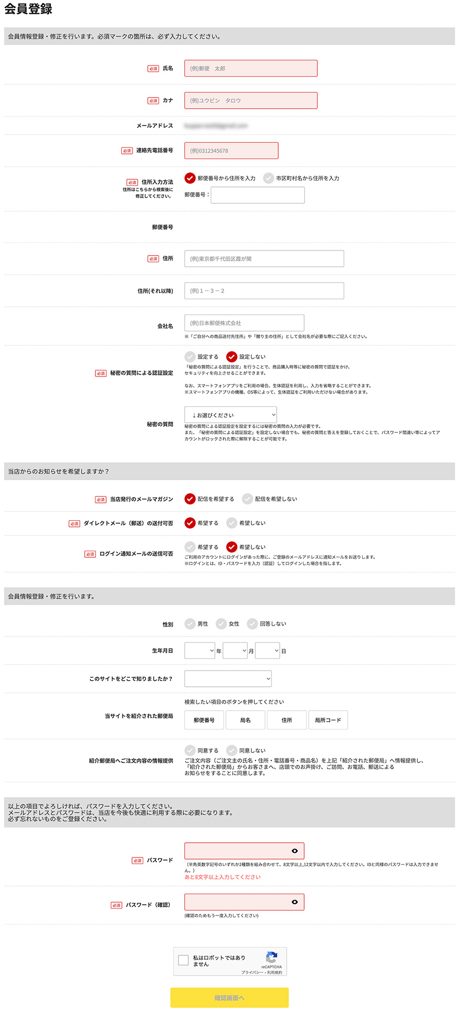 - 会員情報登録を行います。必要情報をご入力いただき、「確認画面へ」ボタンをクリックしてください。