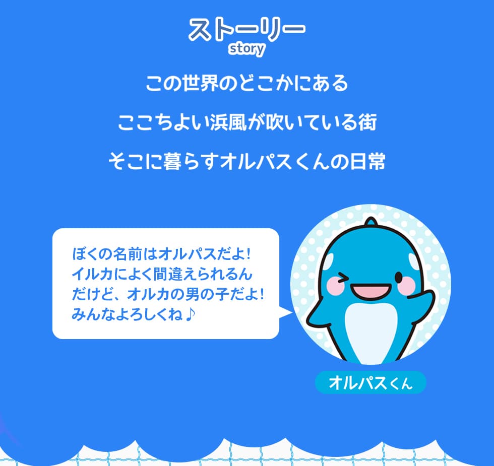 ストーリーこの世界のどこかにあるここちよい浜風が吹いている街そこに暮らすオルパスくんの日常ぼくの名前はオルパスだよ!イルカによく間違えられるんだけど、オルカの男の子だよ!みんなよろしくね♪オルパスくん