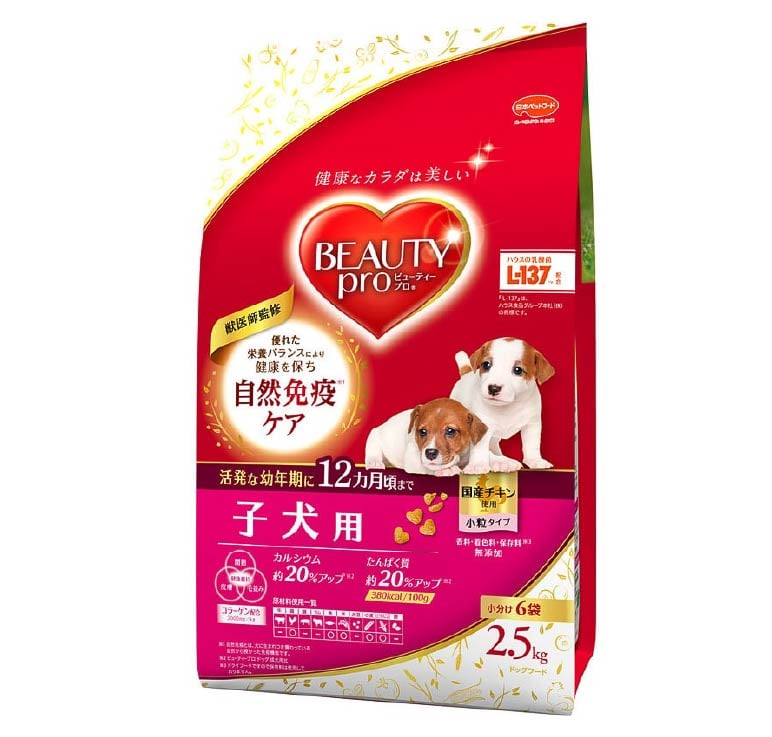 ビューティープロ ドッグ 子犬用は、生後12か月までの子犬にぴったりのドライタイプの総合栄養食です。「健康と美しさを体の中から」をテーマに、獣医師の監修のもと、最新の栄養学に基づいて作られています。体型の維持だけでなく、免疫力、歯、関節の健康にも配慮されているのが特徴です。