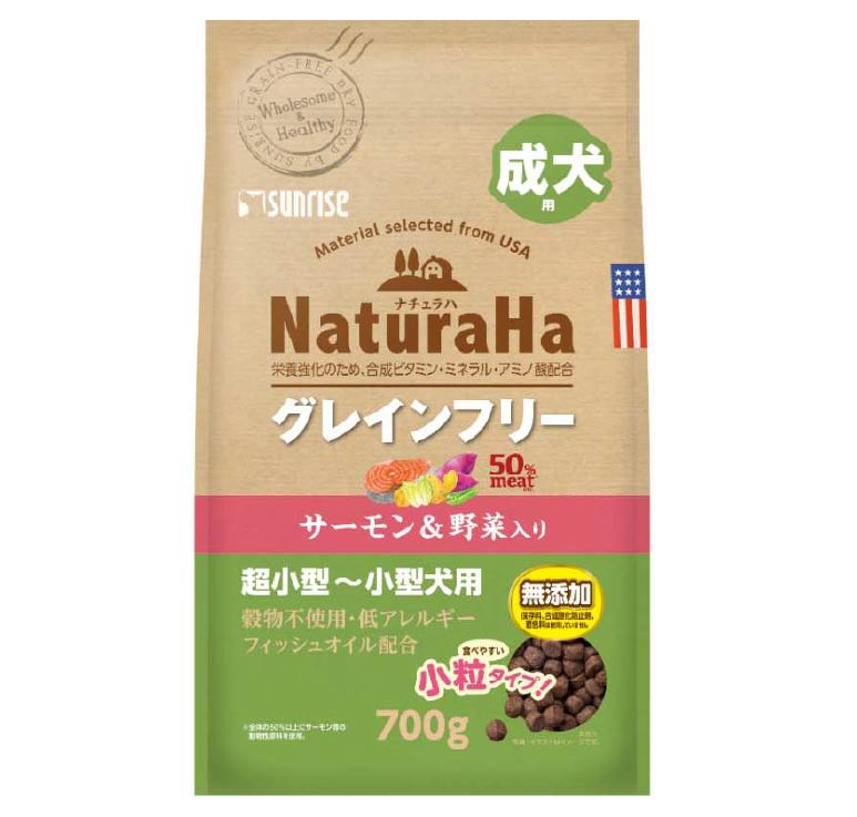 ナチュラハの「グレインフリー サーモン&野菜入り」は、超小型〜小型犬の成犬向けのドライタイプ総合栄養食です。グレインフリーとは、穀物を使用していないことを意味します。犬は、人間と比べて穀物を消化する酵素が少ないため、消化しづらいとされています。