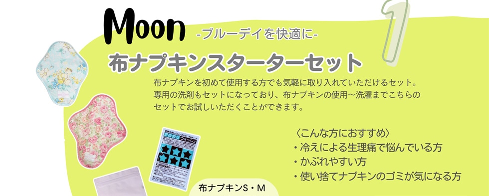 Femoneーフェモネー あらゆる女性にそれぞれのフェムケアでいまより心地よい日常を 大切な人や自分に届けるフェムケアの贈りもの 悩みに合わせたFemoneの快適セット 1.Moon-ブルーデイを快適に-布ナプキンスターターセット 布ナプキンを初めて使用する方でも気軽に取り入れていただけるセット。専用の洗剤もセットになっており、布ナプキンの使用~洗濯までこちらのセットでお試しいただくことができます。布ナプキンS・M 布ナプキン用洗剤 持ち運び用防水袋 <こんな方におすすめ>・冷えによる生理痛で悩んでいる方・かぶれやすい方・使い捨てナプキンのゴミが気になる方
