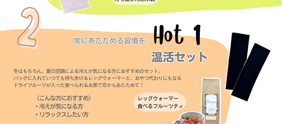 2.Hot1-常にあたためる習慣を-温活セット 冬はもちろん、夏の空調による冷えが気になる方におすすめのセット。バッグに入れていつでも持ち歩けるレッグウォーマーと、おやつ代わりにもなるドライフルーツが入った食べられるお茶で芯からあたためて!レッグウォーマー食べるフルーツティ <こんな方におすすめ>・冷えが気になる方・リラックスしたい方