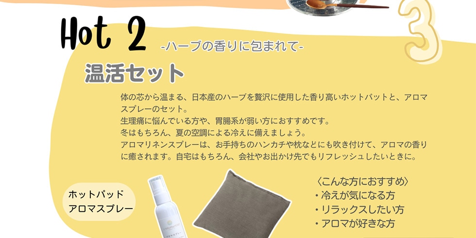 3.Hot2-ハーブの香りに包まれて-温活セット 体の芯から温まる、日本産のハーブを贅沢に使用した香り高いホットパットと、アロマスプレーのセット。生理痛に悩んでいる方や、胃腸系が弱い方におすすめです。冬はもちろん、夏の空調による冷えに備えましょう。アロマリネンスプレーは、お手持ちのハンカチや枕などにも吹き付けて、アロマの香り に癒されます。自宅はもちろん、会社やお出かけ先でもリフレッシュしたいときに。ホットパッドアロマスプレー <こんな方におすすめ>・冷えが気になる方・リラックスしたい方・アロマが好きな方