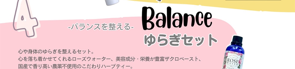 4.Balance-バランスを整える-ゆらぎセット 心や身体のゆらぎを整えるセット。心を落ち着かせてくれるローズウォーター、美容成分・栄養が豊富ザクロペースト、国産で香り高い農薬不使用のこだわりハーブティー。身体の内側からゆらぎにアプローチします。スキンケアやボディケアのように、日々の心のケアを。ローズウォーター ザクロペースト 無農薬ハーブティー <こんな方におすすめ>・ホルモンバランスの乱れが気になる方・心のケアを大切にしている方・美肌になりたい方