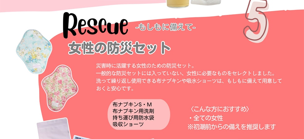 5.Rescue-もしもに備えて-女性の防災セット 災害時に活躍する女性のための防災セット。一般的な防災セットには入っていない、女性に必要なものをセレクトしました。洗って繰り返し使用できる布ナプキンや吸水ショーツは、もしもに備えて用意しておくと安心です。布ナプキンS・M 布ナプキン用洗剤 持ち運び用防水袋 吸収ショーツ <こんな方におすすめ>・全ての女性※初潮前からの備えを推奨します