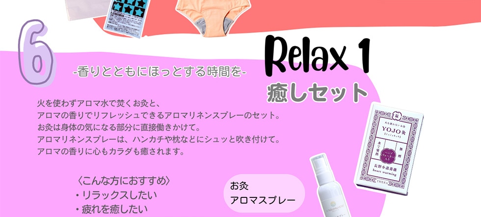 6.Relax-香りとともにほっとする時間を-癒しセット 火を使わずアロマ水で焚くお灸と、アロマの香りでリフレッシュできるアロマリネンスプレーのセット。お灸は身体の気になる部分に直接働きかけて。アロマリネンスプレーは、ハンカチや枕などにシュッと吹き付けて。 アロマの香りに心もカラダも癒されます。お灸アロマスプレー <こんな方におすすめ>・リラックスしたい・疲れを癒したい