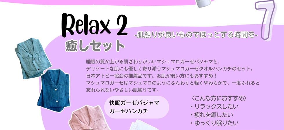 7.Relax2-肌触りが良いものでほっとする時間を-癒しセット 睡眠の質が上がる肌ざわりがいいマシュマロガーゼパジャマと、デリケートな肌にも優しく寄り添うマシュマロガーゼタオルハンカチのセット。日本アトピー協会の推薦品です。お肌が弱い方にもおすすめ!マシュマロガーゼはマシュマロのようにふんわりと軽くやわらかで、一度ふれると忘れられないやさしい肌触りです。快眠ガーゼパジャマ ガーゼハンカチ <こんな方におすすめ>・リラックスしたい・疲れを癒したい・ゆっくり眠りたい