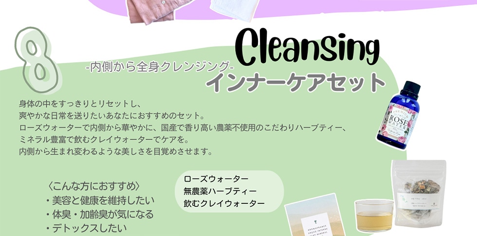 8.Cleansing-内側から全身クレンジング-インナーケアセット 身体の中をすっきりとリセットし、爽やかな日常を送りたいあなたにおすすめのセット。ローズウォーターで内側から華やかに、国産で香り高い農薬不使用のこだわりハーブティー、ミネラル豊富で飲むクレイウォーターでケアを。内側から生まれ変わるような美しさを目覚めさせます。ローズウォーター 無農薬ハーブティー 飲むクレイウォーター <こんな方におすすめ>・美容と健康を維持したい・体臭・加齢臭が気になる・デトックスしたい