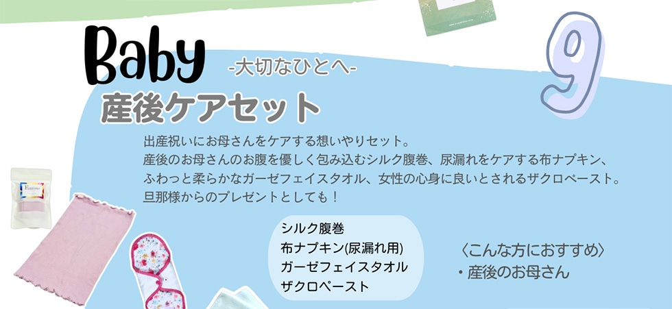 9.Baby-大切なひとへ-産後ケアセット 出産祝いにお母さんをケアする想いやりセット。産後のお母さんのお腹を優しく包み込むシルク腹巻、尿漏れをケアする布ナプキン、ふわっと柔らかなガーゼフェイスタオル、女性の心身に良いとされるザクロペースト。旦那様からのプレゼントとしても! シルク腹巻 布ナプキン (尿漏れ用) ガーゼフェイスタオル ザクロペースト <こんな方におすすめ>・産後のお母さん