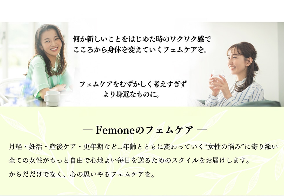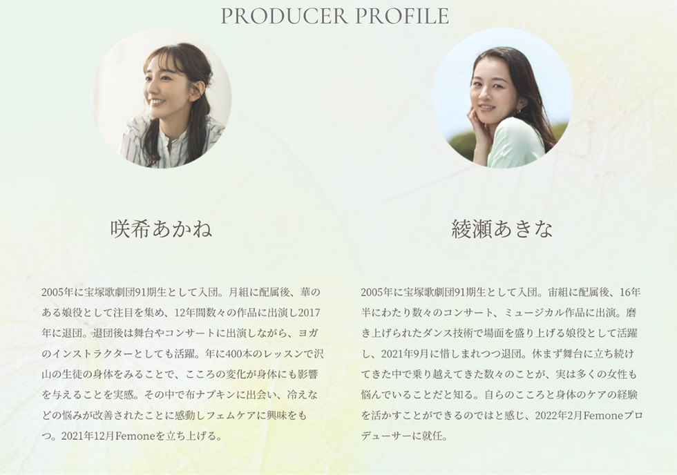 何か新しいことをはじめた時のワクワク感で こころから身体を変えていくフェムケアを。フェムケアをむずかしく考えすぎずより身近なものに。-Femoneのフェムケアー 月経・妊活・産後ケア・更年期など...年齢とともに変わっていく“女性の悩み”に寄り添い全ての女性がもっと自由で心地よい毎日を送るためのスタイルをお届けします。からだだけでなく、心の思いやるフェムケアを。 PRODUCER PROFILE 咲希あかね 2005年に宝塚歌劇団91期生として入団。月組に配属後、華のある娘役として注目を集め、12年間数々の作品に出演し2017年に退団。 退団後は舞台やコンサートに出演しながら、ヨガのインストラクターとしても活躍。年に400本のレッスンで沢山の生徒の身体をみることで、こころの変化が身体にも影響を与えることを実感。その中で布ナプキンに出会い、冷えなどの悩みが改善されたことに感動しフェムケアに興味をもつ。2021年12月Femoneを立ち上げる。 綾瀬あきな 2005年に宝塚歌劇団91期生として入団。宙組に配属後、16年半にわたり数々のコンサート、ミュージカル作品に出演。磨き上げられたダンス技術で場面を盛り上げる娘役として活躍し、2021年9月に惜しまれつつ退団。休まず舞台に立ち続けてきた中で乗り越えてきた数々のことが、実は多くの女性も悩んでいることだと知る。自らのこころと身体のケアの経験を活かすことができるのではと感じ、2022年2月Femoneプロデューサーに就任。