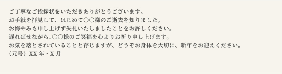 喪中はがきへのお返事は、「寒中見舞い」と本記事でご紹介する「喪中見舞い」があります。「寒中見舞い」は“松の内(※)が明けてから立春まで”と送る時期が決まっていますが、「喪中見舞い」は特に決まっていません。