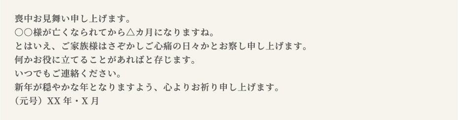 〇〇様が亡くなられてから△ヶ月になりますね。徐々にではありますが、寂しさが和らぐこと心よりお祈り申し上げます。