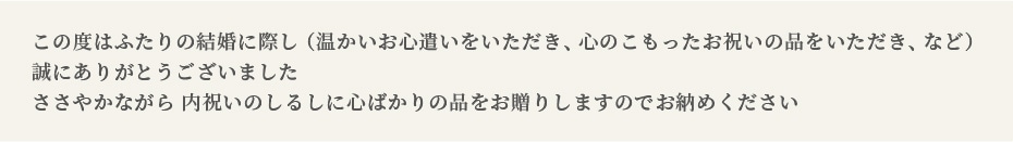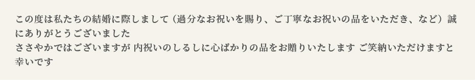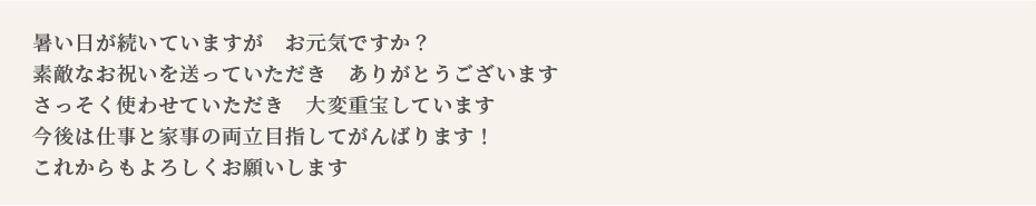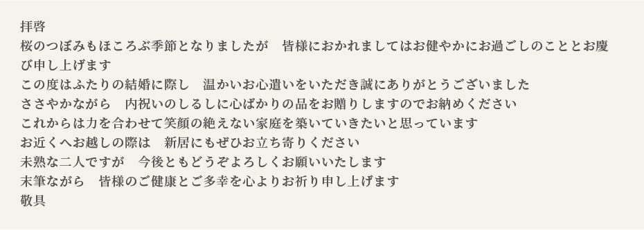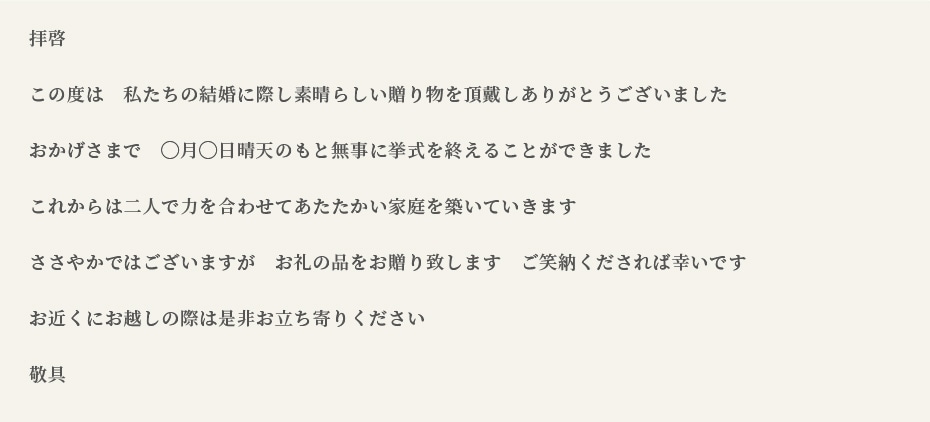 親しいご親戚など、あまり堅苦しい感じを出したくないようでしたら、お気持ちに感謝する言葉を選んでみましょう。これに続けて「戴いたお祝いで○○を購入し、新婚生活に楽しく役立てております」のように、使い道などもご報告できると喜んでいただけます。