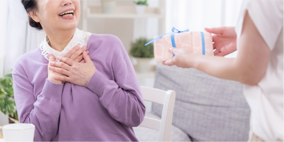 お祝いの定番といえばお花。特に女性にとっては、うれしいプレゼントのひとつです。生花も素敵ですが、色鮮やかなまま長く飾っておくことができ、手入れも簡単なプリザーブドフラワーは特におすすめ。「いつまでもきれいでいきいきとしたお母様でいてほしい」というメッセージにもつながります。