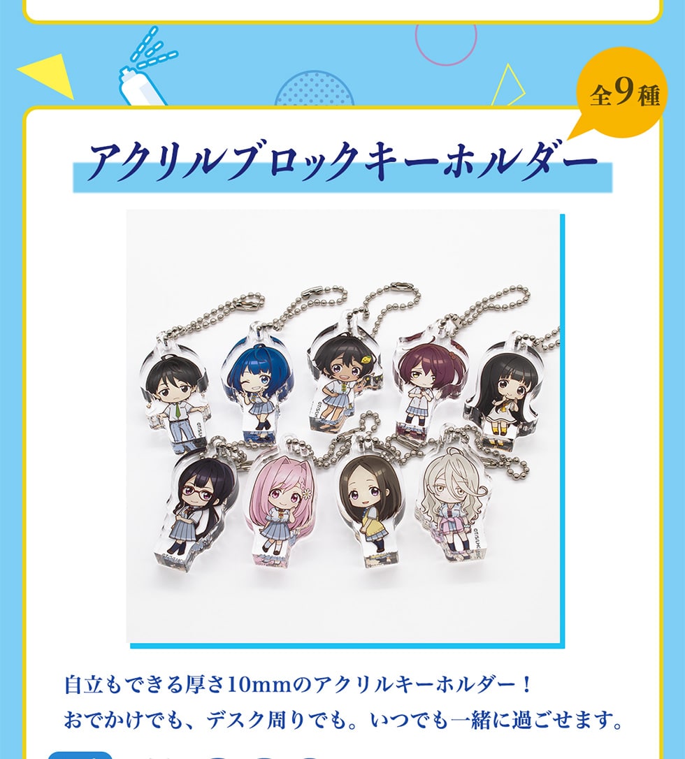 全9種アクリルブロックキーホルダー 自立もできる厚さ10mmのアクリルキーホルダー!おでかけでも、デスク周りでも。いつでも一緒に過ごせます。