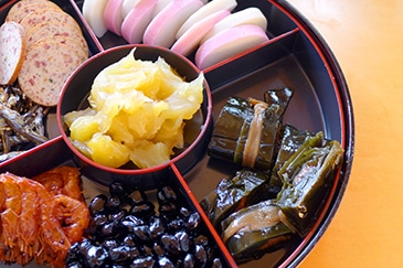 ねっとりと粘り気が強い濃厚な甘さの栗きんとんは、おせちの定番料理であり子どもにも喜ばれる一品です。甘露煮にした栗をさつまいもや栗でできた餡とあえて作られ、クチナシを用いるとより色鮮やかな黄金色になります。きんとんは「金団」と書き、「金色の団子」もしくは「金色の布団」という意味があります。黄金色の見た目を金塊や小判などに見立てていることから、転じて金運上昇を願う料理になりました。また「勝ち栗」とも言われるように、武家社会では戦の勝機を高めるための縁起物として重宝されたという経緯があります。幸先の良い食べ物である栗を一年の始まりの日にいただくことで「勝負強い一年でありますように」と縁起を担ぐことができます。