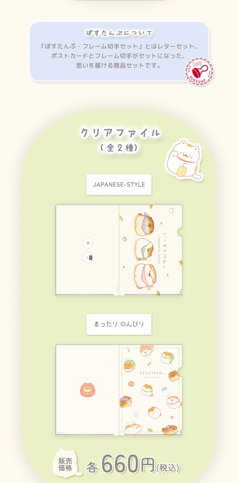 ぽすたんぷについて 『ぽすたんぷ・フレーム切手セット』 とはレターセット、ポストカードとフレーム切手がセットになった、思いを届ける商品セットです。 クリアファイル (全2種) 販売価格 各660円 (税込)