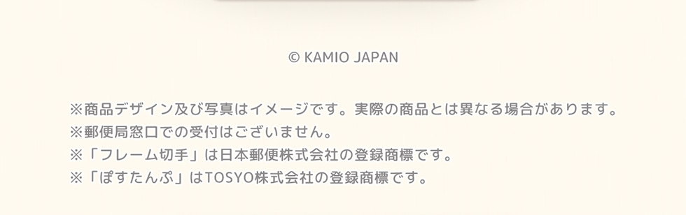 © KAMIO JAPAN ※商品デザイン及び写真はイメージです。実際の商品とは異なる場合があります。※郵便局窓口での受付はございません。※「フレーム切手」は日本郵便株式会社の登録商標です。※「ぽすたんぷ」はTOSYO株式会社の登録商標です。
