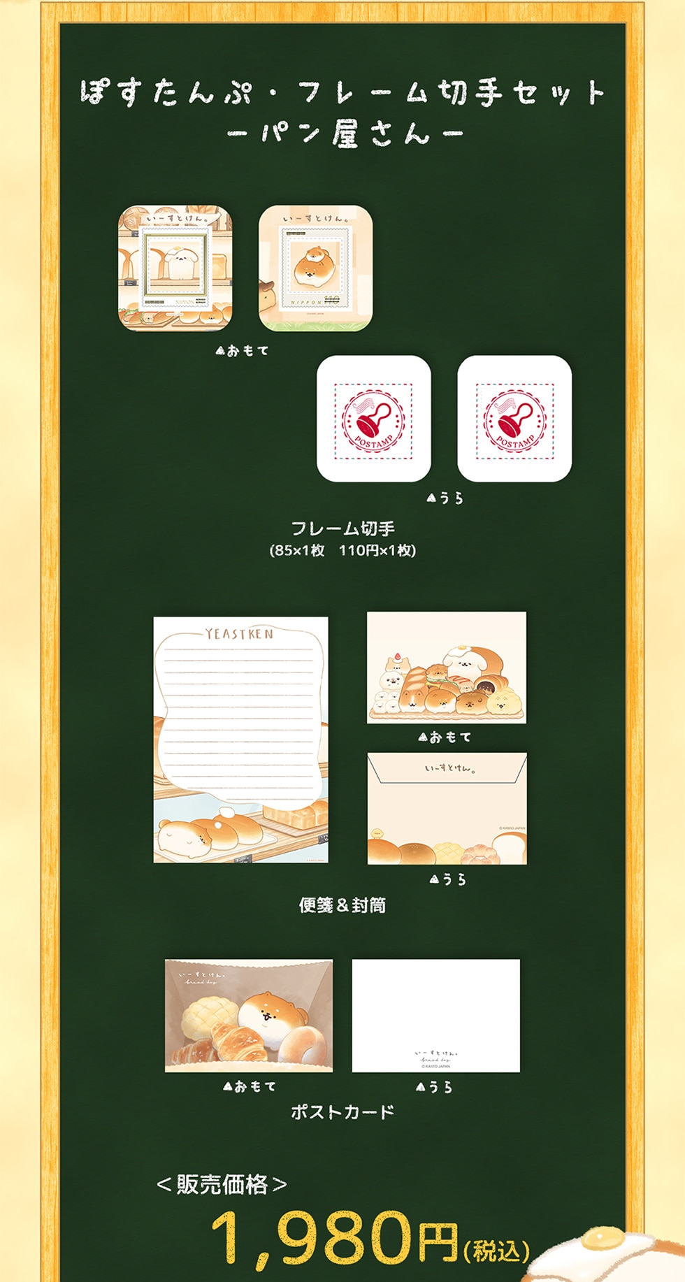 ぽすたんぷフレーム切手セット パン屋さん フレーム切手(85×1枚110円×1枚)便箋&封筒ポストカード<販売価格>1,980円(税込)