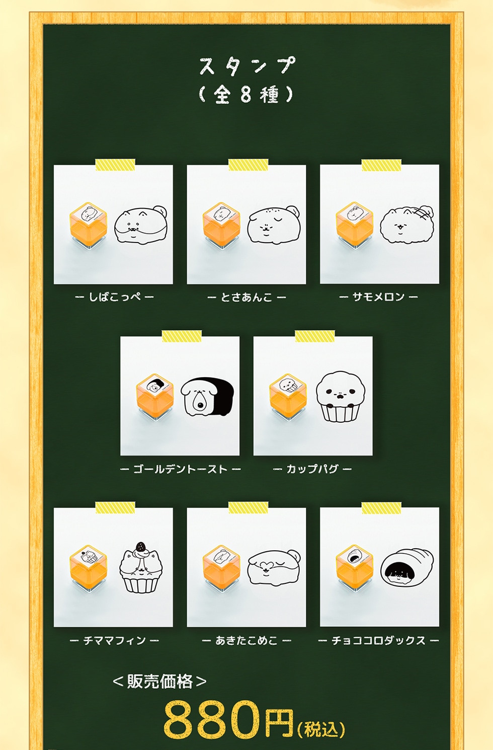 スタンプ(全8種)しばこっぺ とさあんこ サモメロン ゴールデントースト カップパグ チママフィン あきたこめこ チョココロダックス <販売価格>880円(税込)