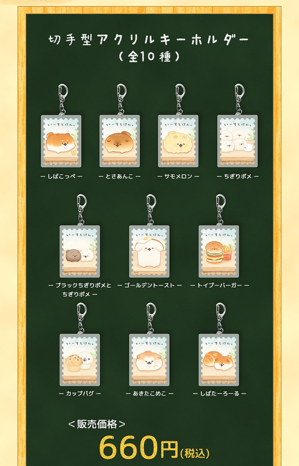 切手型アクリルキーホルダー(全10種) しばこっぺ とさあんこ サモメロン ちぎりポメ ブラックちぎりポメとちぎりポメ ゴールデントースト トイプーバーガー カップパグ あきたこめこ しばたーろーる <販売価格>660円(税込)